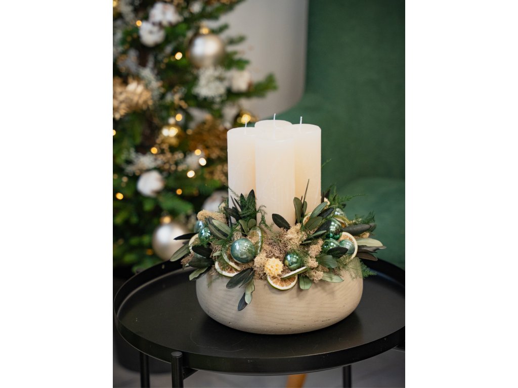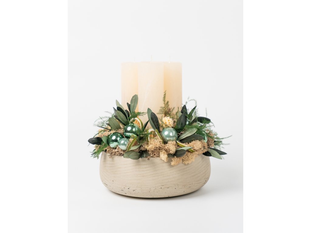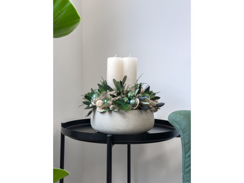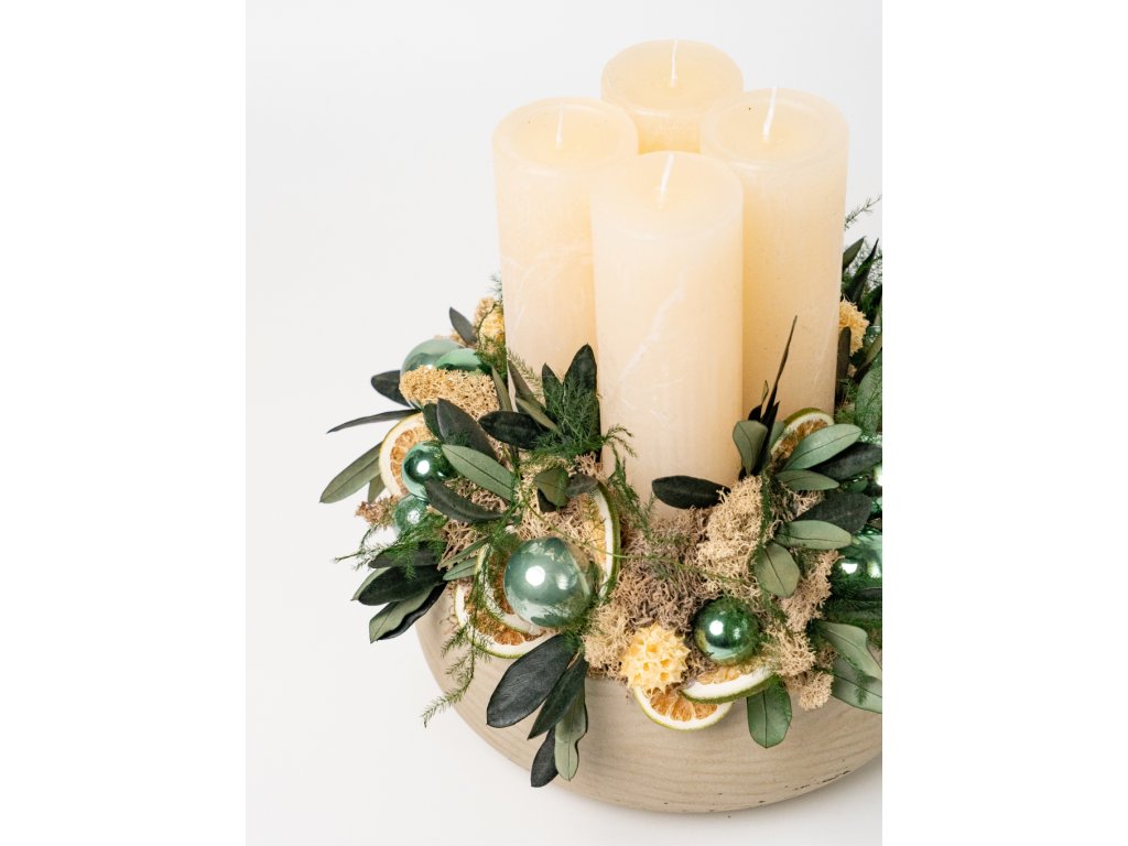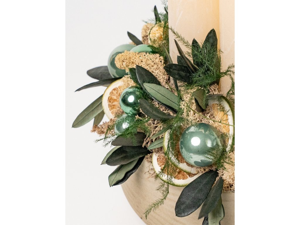 Vďaka použitým stabilizovaným rastlinám, lišajníku a prírodnej sušine si veniec zachováva svoju krásu niekoľko rokov – bez údržby, bez polievania, bez starostí. Aranžmán dopĺňajú elegantné krémové sviečky a sklenené vianočné gule v zelených odtieňoch, ktoré dodávajú celku moderný sviatočný vzhľad.