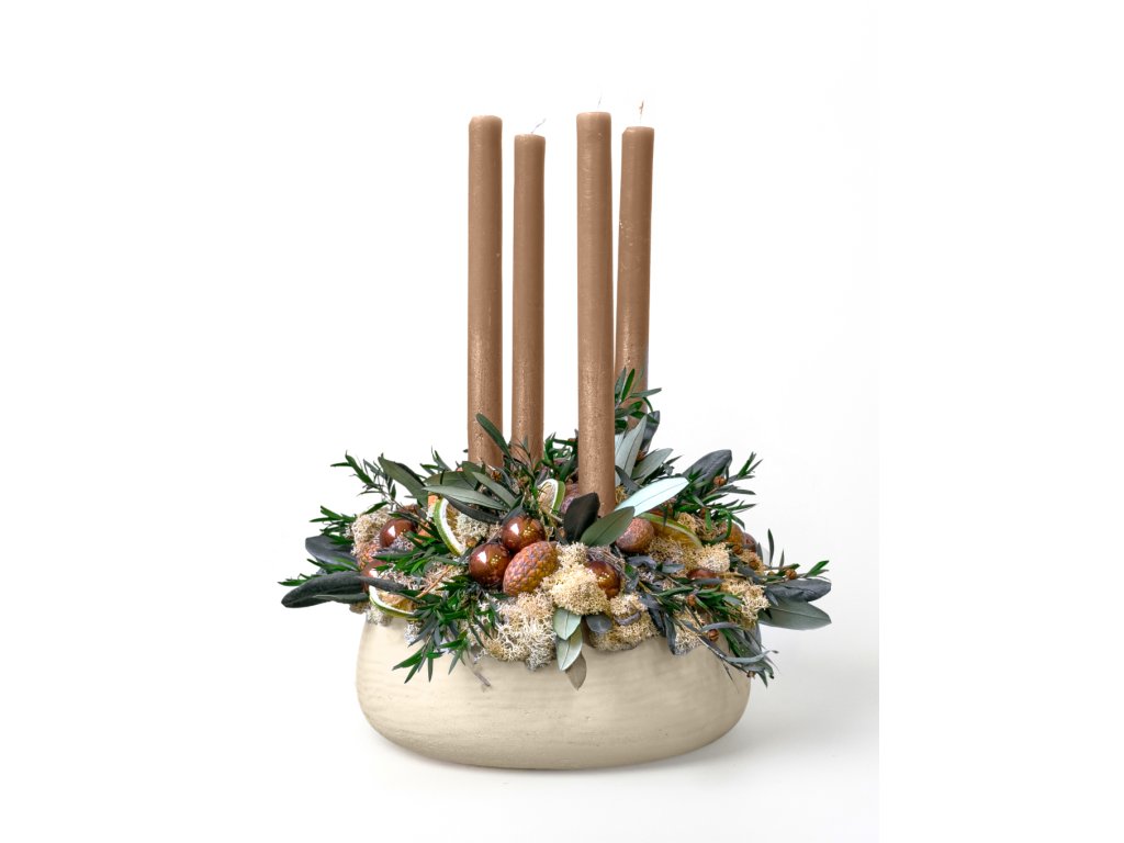 Štyri vysoké sviečky v karamelovo-hnedých tónoch vytvárajú harmonický stred, okolo ktorého sa rozprestiera bohatá kompozícia stabilizovaného lišajníka, stabilizovaných rastlín, prírodnej sušiny a sklenených vianočných gulí. Prírodné prvky ako šišky, škorica, sušené citrusy a tmavozelené vetvičky dodávajú aranžmánu autentický lesný nádych.