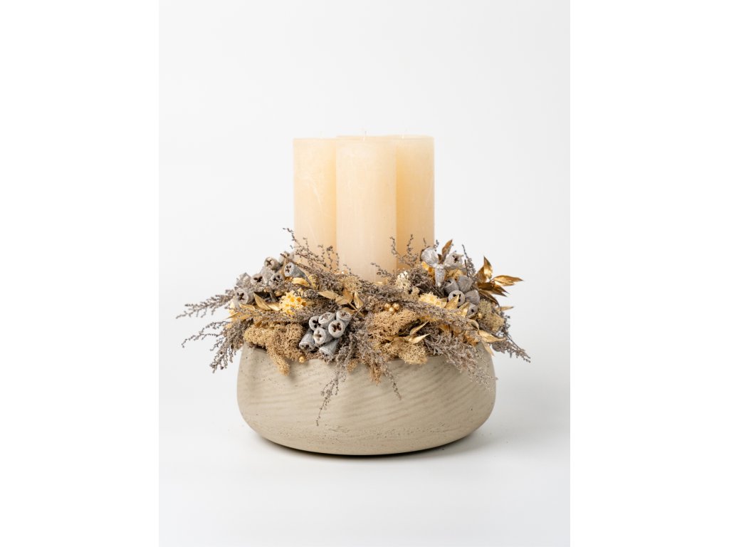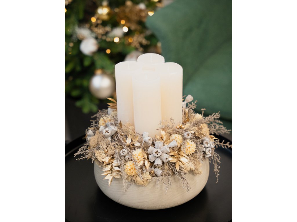 Dominantou aranžmánu sú krémové sviečky, obklopené bohatou textúrou stabilizovaného lišajníka, sušených rastlín a stabilizovaných prírodných prvkov. Zlaté detaily dodávajú vencu jemný sviatočný lesk, no stále zachovávajú jeho prírodnú a harmonickú estetiku.