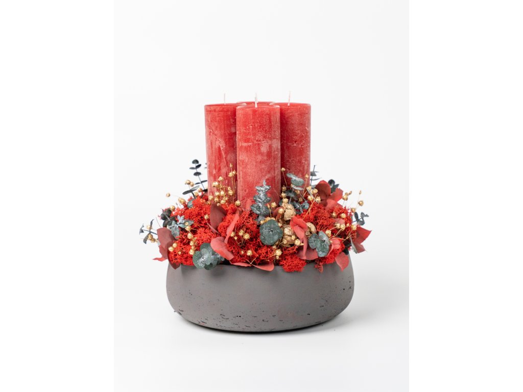 Dominantou aranžmánu sú červené sviečky, obklopené bohatou textúrou stabilizovaného červeného lišajníka, stabilizovaných rastlín a prírodnej sušiny. Vďaka stabilizácii si materiály zachovávajú svoju farbu a tvar celé roky – bez polievania, bez opadávania, bez starostí. Zlatisté akcenty dodávajú adventnému vencu sviatočnú iskru a robia z neho výnimočnú dekoráciu do každého interiéru.