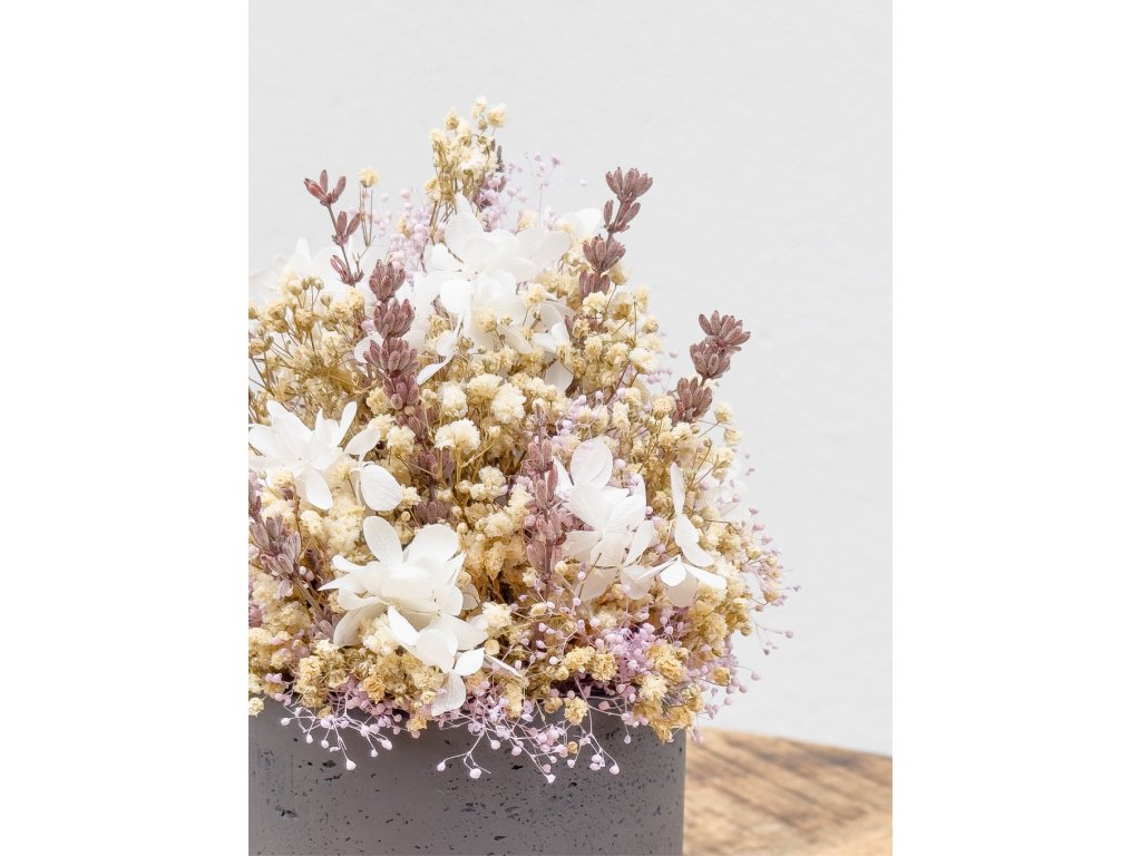 Dominujú biele kvety stabilizovanej hortenzie, doplnené o jemnú bielu a krémovú gypsomilku a drobné pastelovo ružové akcenty. Výraznejšie štruktúry a vertikálny akcent vytvárajú levanduľovo-fialové klasy, ktoré aranžmánu dodávajú elegantný charakter.