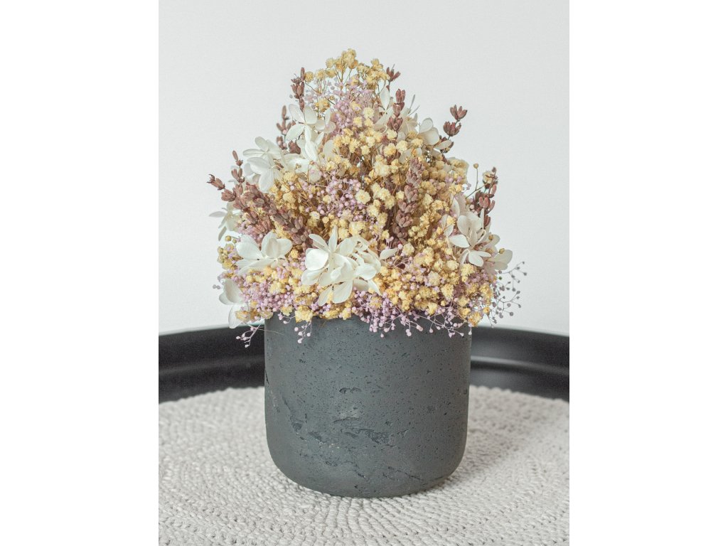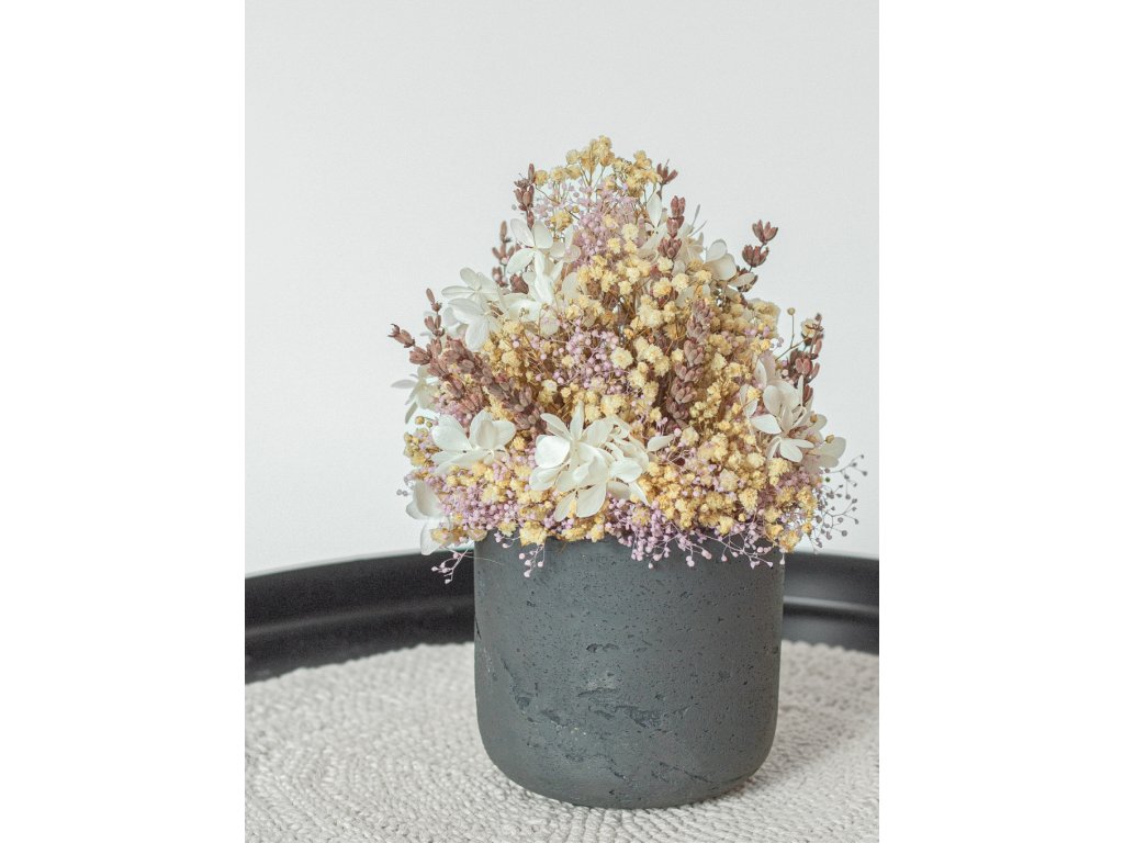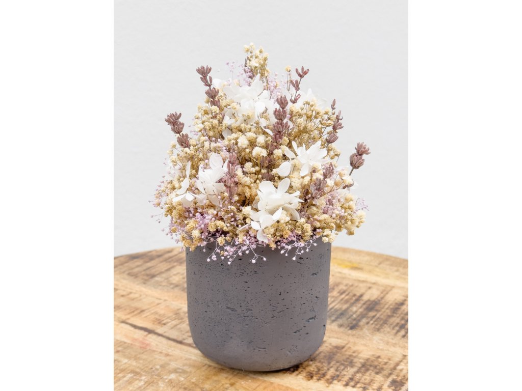 Lavender Whisper je jemný a romantický aranžmán, ktorý očarí svojou nežnou farebnou harmóniou. Sivý kompozitný kvetináč s matnou textúrou dodáva aranžmánu moderný, minimalistický vzhľad a dokonale kontrastuje so svetlými a pastelovými tónmi kvetov.