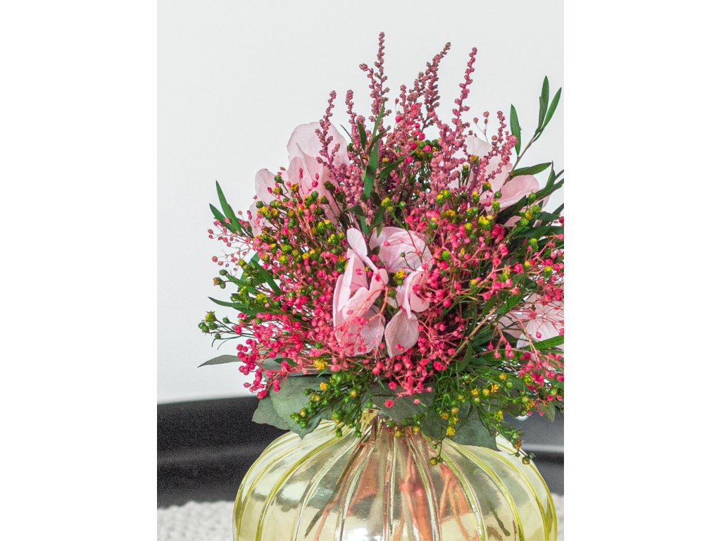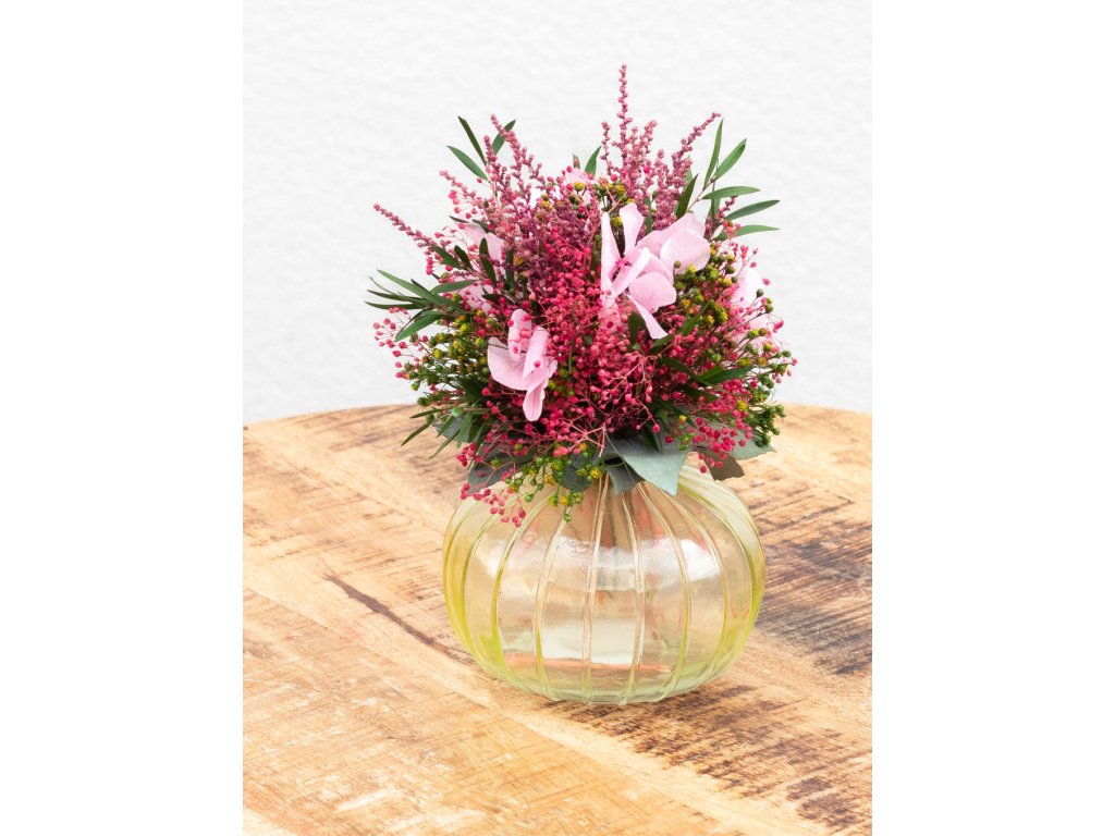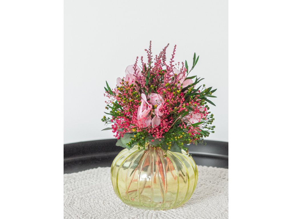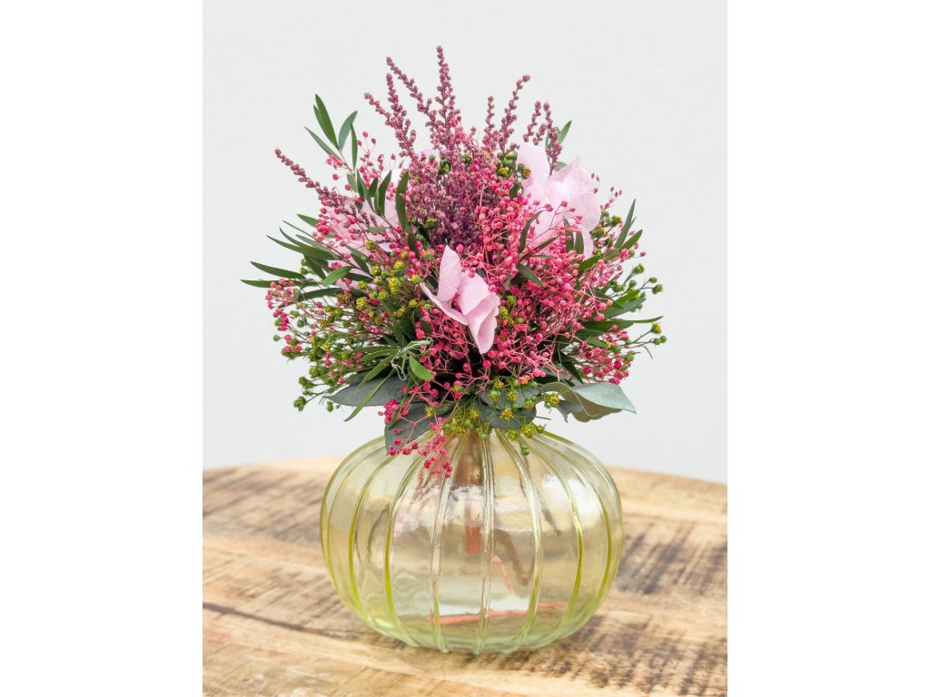 Tento jemný a nadčasový aranžmán zo starostlivo vybraných stabilizovaných kvetov okamžite zútulní váš interiér. Elegantná sklenená vázička zvýrazňuje prirodzenú krásu kvetov a dodáva aranžmánu ľahkosť a moderný vzhľad.