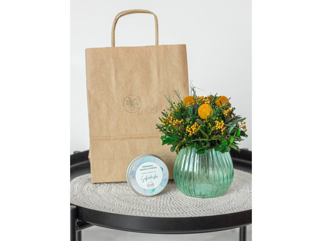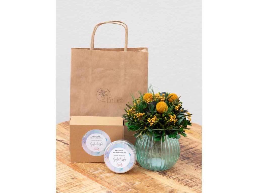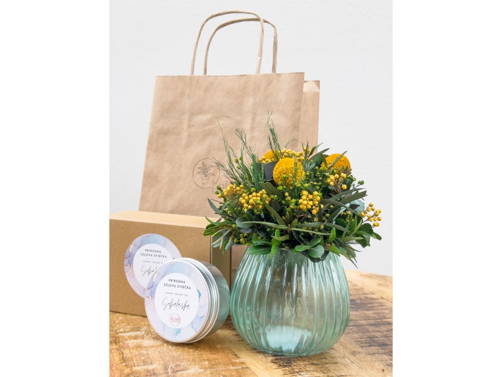 Súčasťou sady je elegantný aranžmán zo stabilizovaných kvetov Green Forest, v ktorom sa mieša sýta zeleň eukalyptu, buxusu a ďalších prírodných prvkov s výraznými žltými akcentmi kraspédie a broomu.