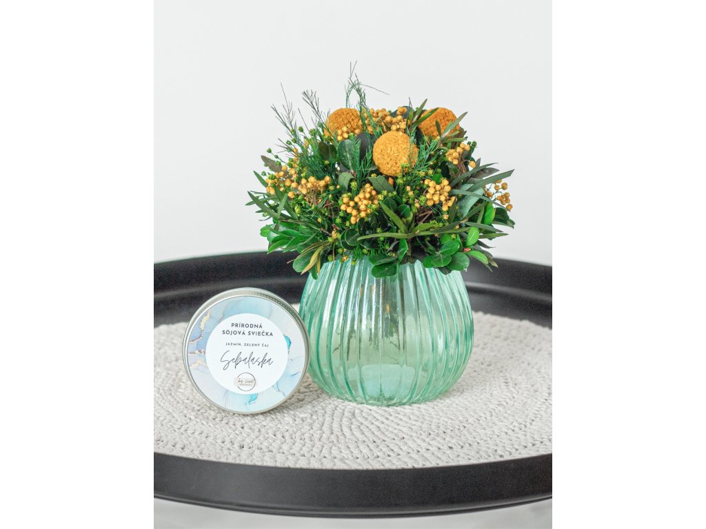 Darčeková sada – aranžmán zo stabilizovaných kvetov "Green Forest" a sójová sviečka s vôňou jazmínu a zeleného čaju