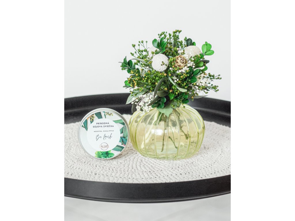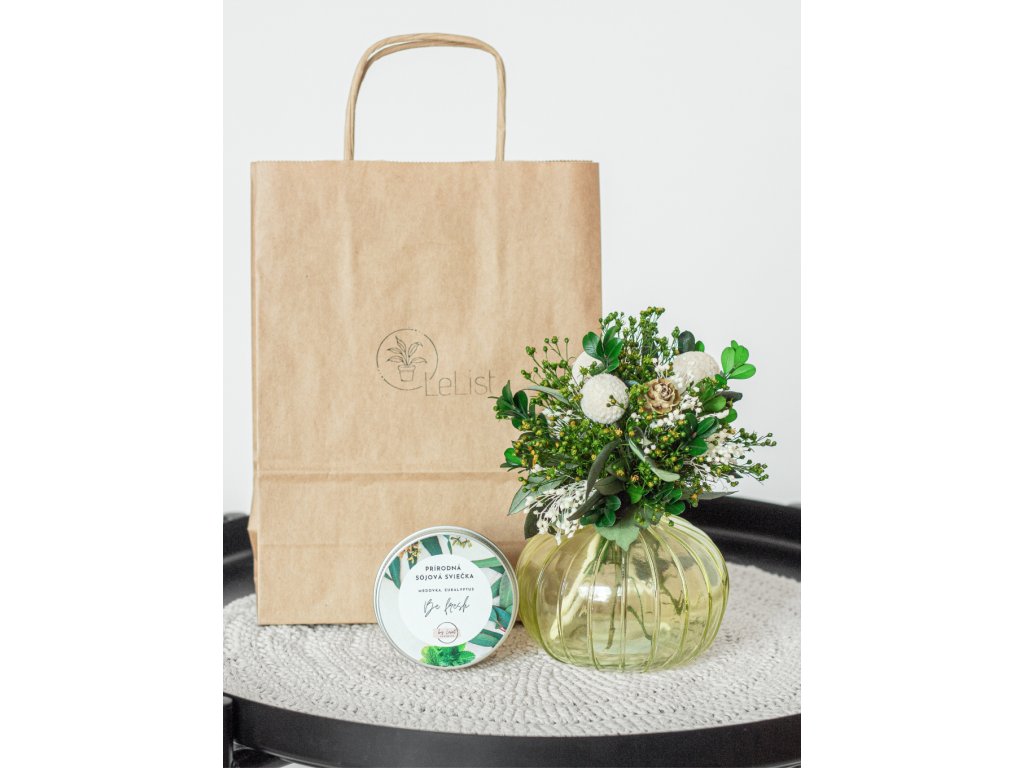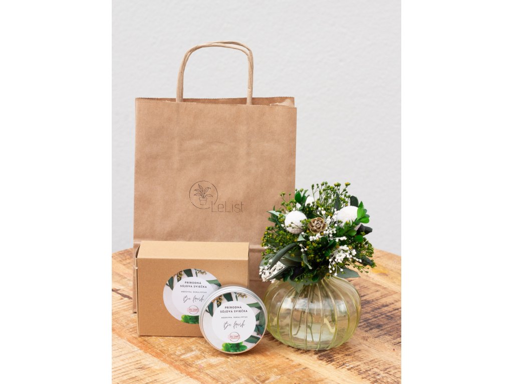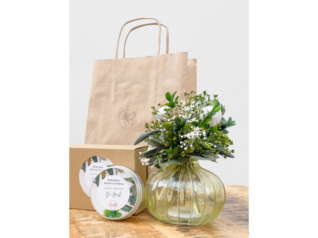 Darčeková sada – aranžmán zo stabilizovaných kvetov "Green Harmony" a sójová sviečka s vôňou medovky a eukalyptu