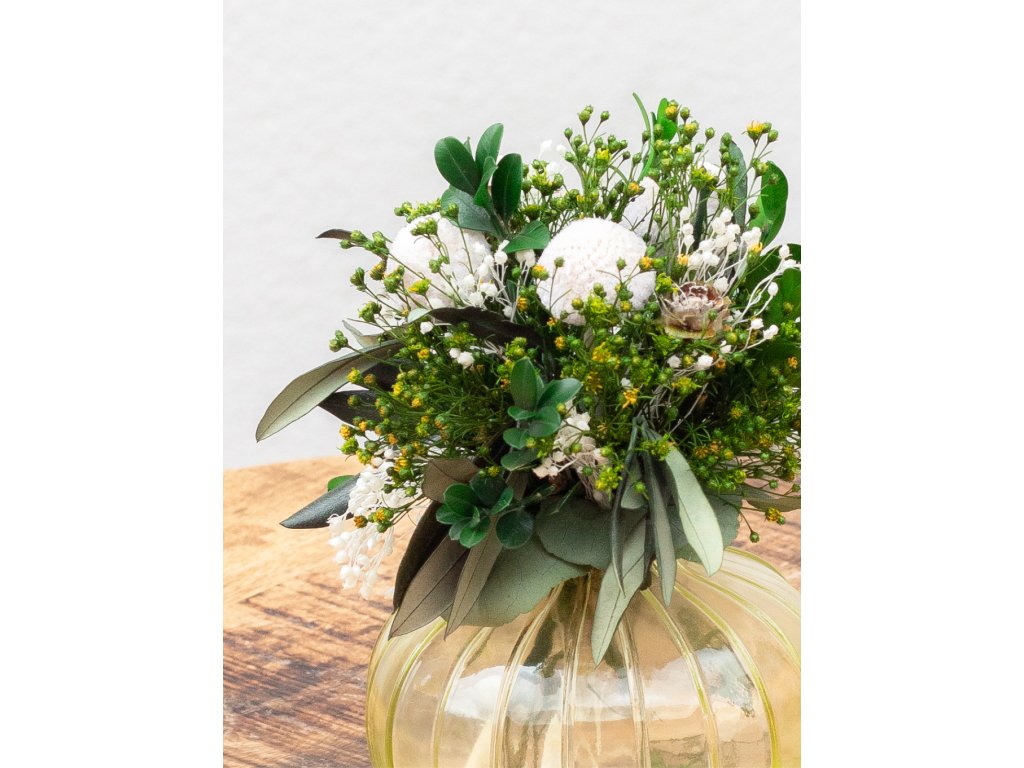 Súčasťou sady je moderný aranžmán zo stabilizovaných kvetov Green Harmony, v ktorom sa spájajú jemné biele akcenty s bohatou zeleňou.