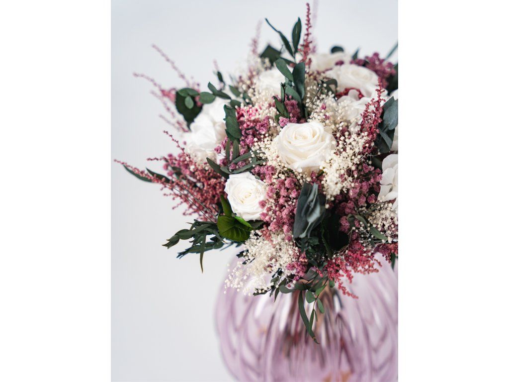 Dominantou kytice sú biele stabilizované ruže doplnené o objemnú hortenziu a jemné ružové akcenty, ktoré vytvárajú harmonickú a elegantnú kompozíciu. Výsledkom je kytica, ktorá pôsobí luxusne, no zároveň prirodzene a nežne.