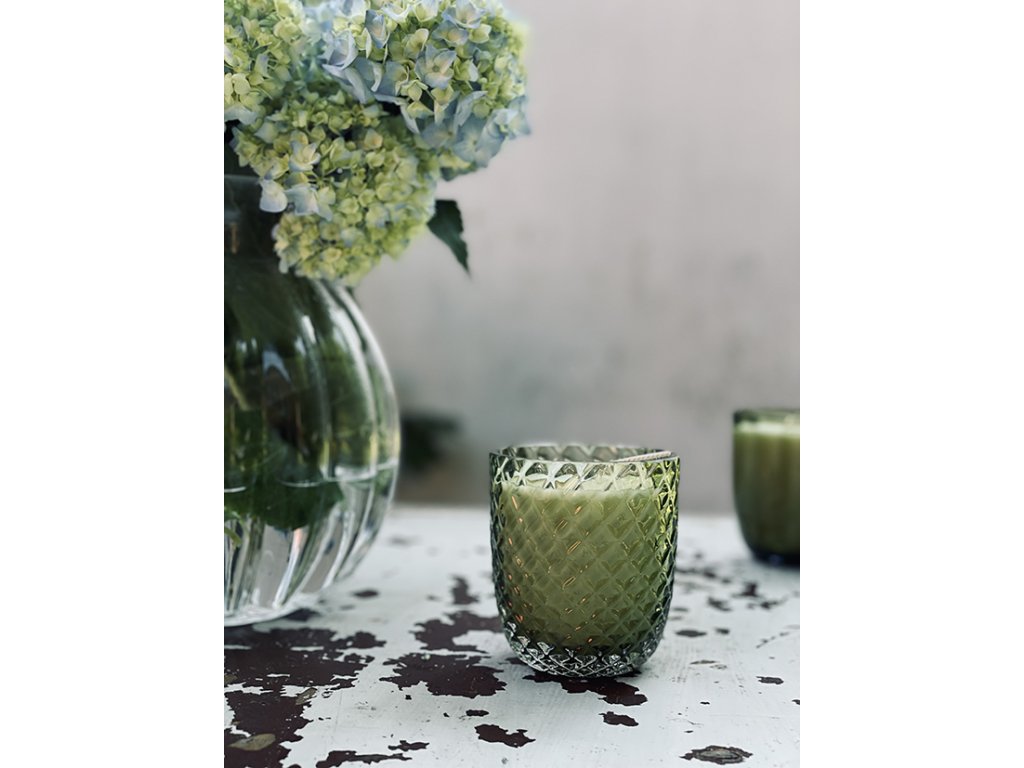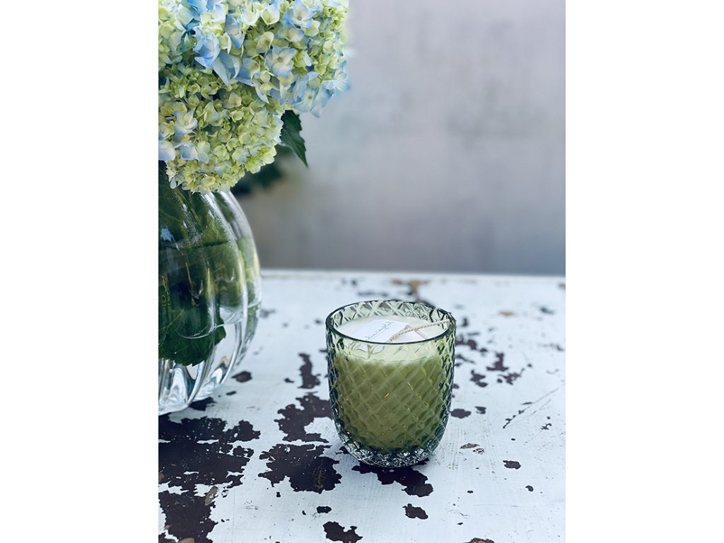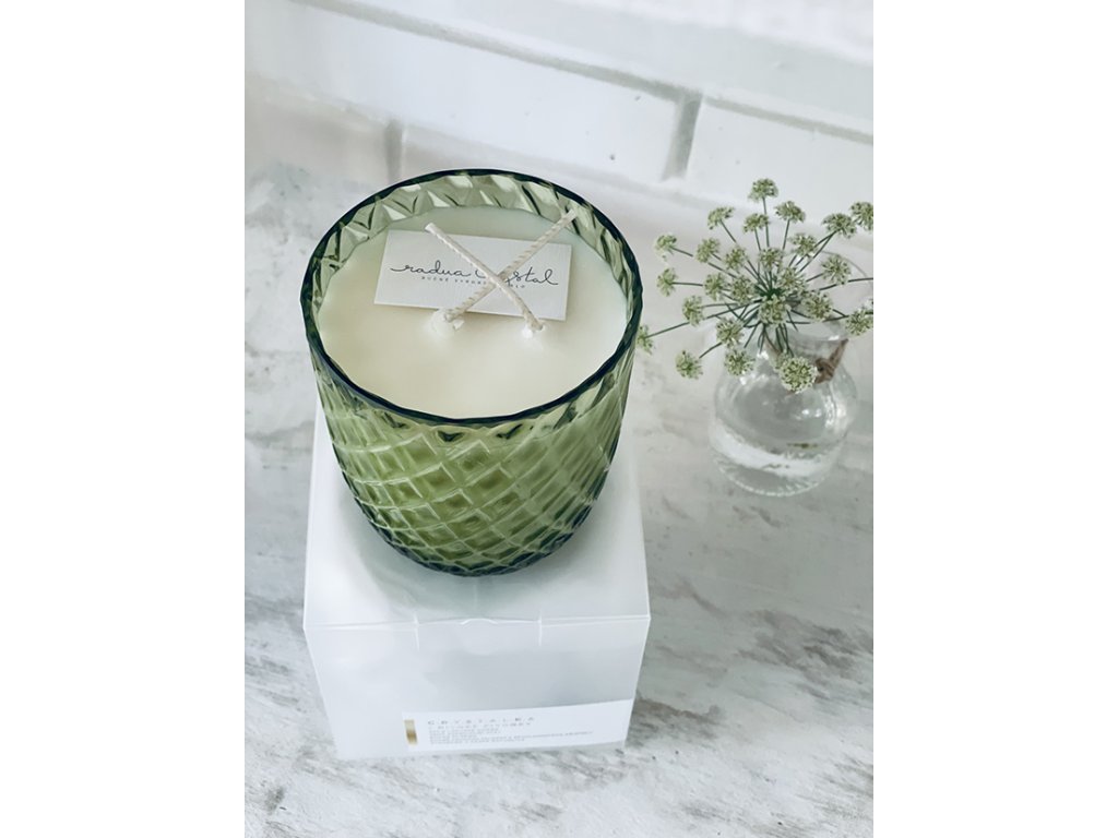 Prírodná sviečka v olivovom krištále "Crystalka" - „Jarná víla s bázovým venčekom“