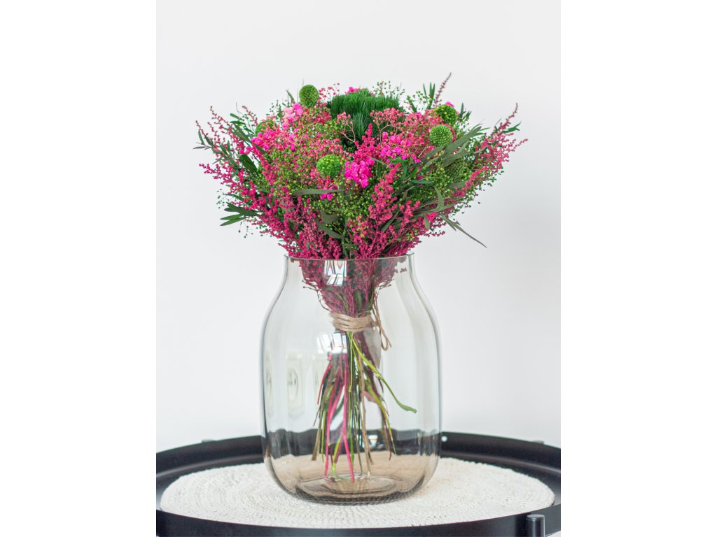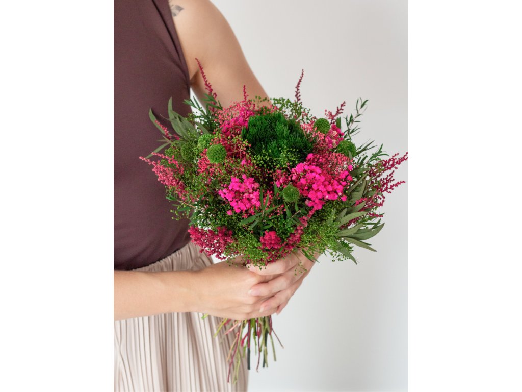 Fresh Romance je pôsobivá kytica plná sviežich zelených a výrazných ružových tónov, ktorá okamžite oživí každý interiér. Kombinácia jemnej gypsomilky v odtieňoch ružovej a zelenej, elegantného eukalyptu a originálnej zelenej kraspédie vytvára harmonický a moderný vzhľad.