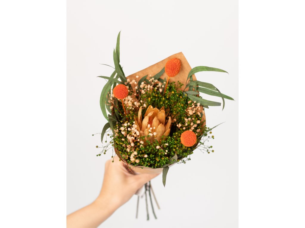 Sunset Protea je originálna kytica, ktorá kombinuje exotickú krásu sušenej protey s jemnosťou stabilizovaných rastlín v teplých oranžovo-zlatých a prírodných tónoch. Ideálna pre tých, ktorí hľadajú netradičný, elegantný a trvácny darček alebo výraznú dekoráciu do interiéru.