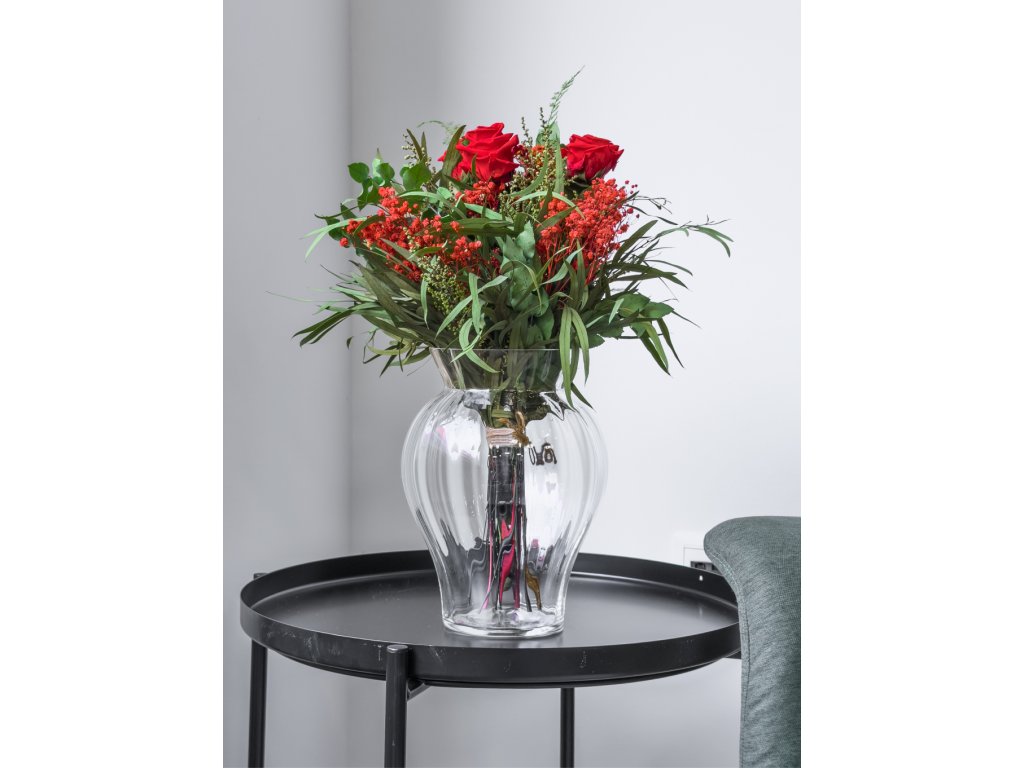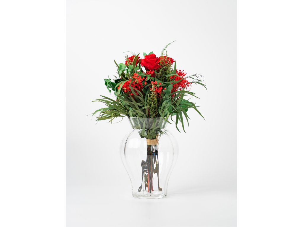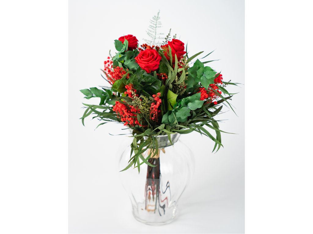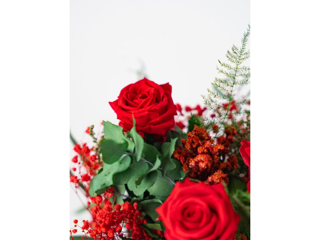 Stabilizované červené ruže symbolizujú hlboké city a romantiku, zatiaľ čo eukalyptus, stoebe a asparagus dodávajú kytici prirodzenosť, sviežosť a moderný charakter. Červená gypsomilka a solidago jemne dopĺňajú kompozíciu a zvýrazňujú jej atmosféru.