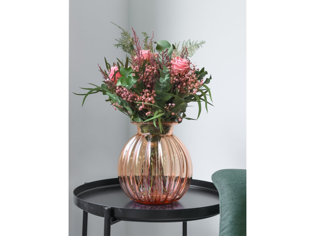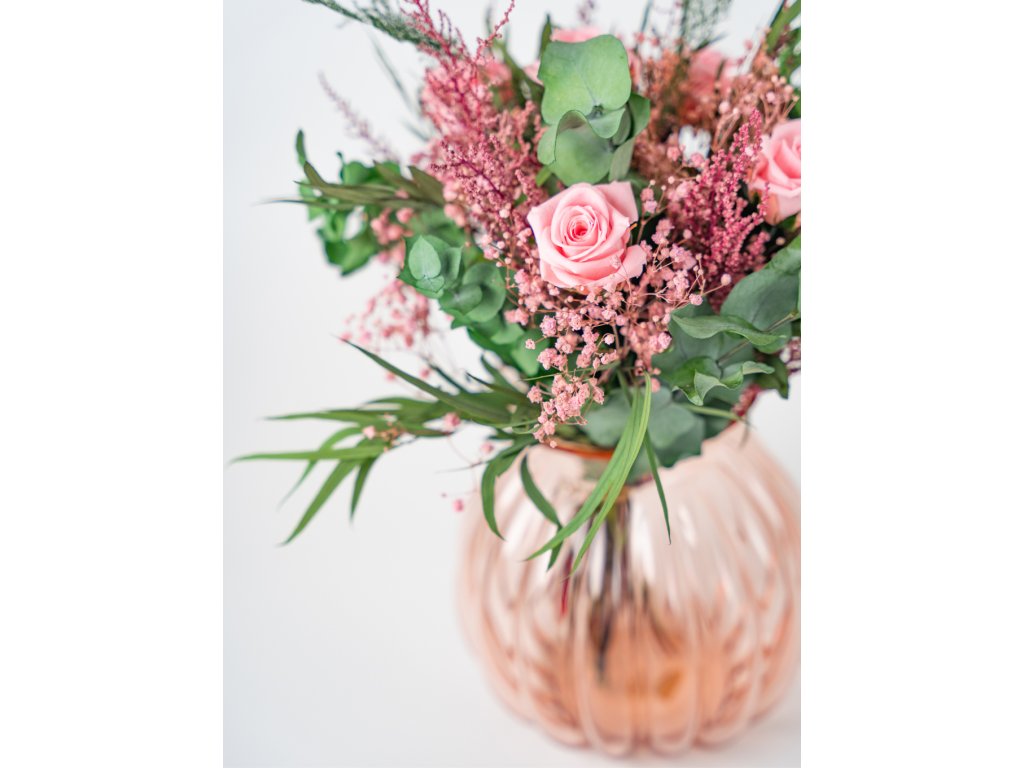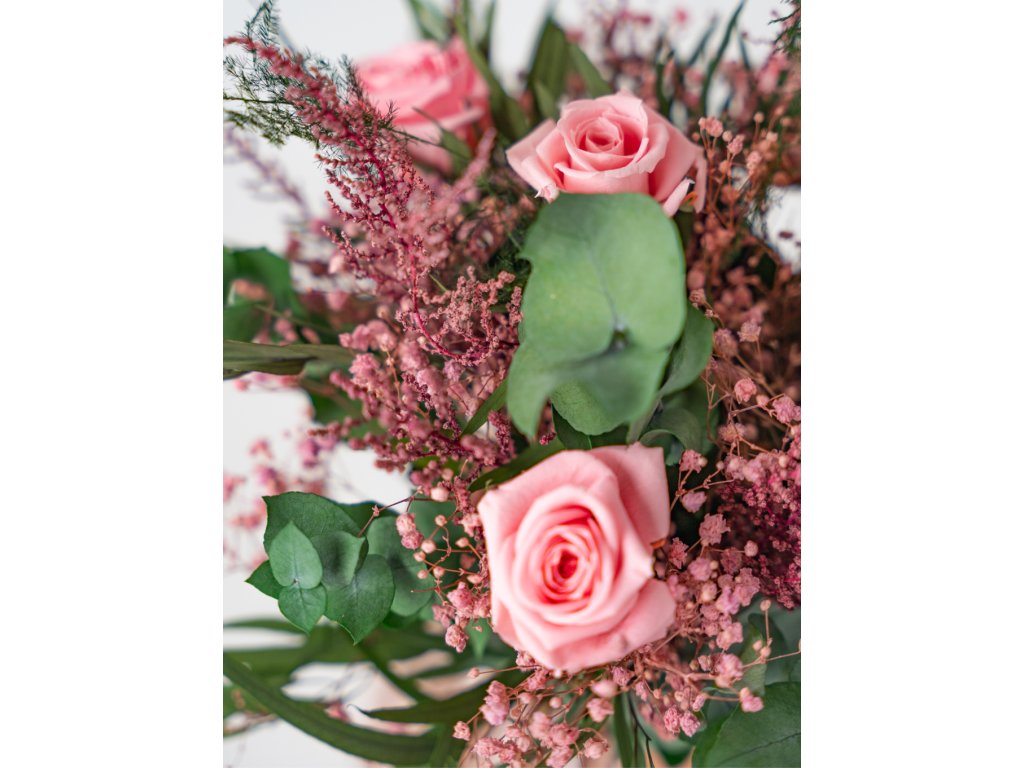Táto kytica zo stabilizovaných kvetov je nadčasovým vyjadrením lásky, vášne a pozornosti, ktorá pretrvá. Kombinácia ružových stabilizovaných ruží, jemnej gypsomilky a eukalyptu vytvára harmonický a romantický vzhľad, ktorý pôsobí prirodzene a nadčasovo.
