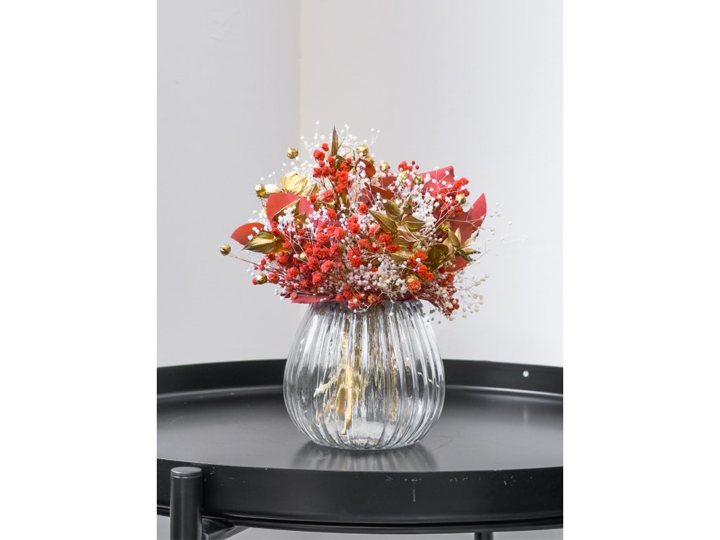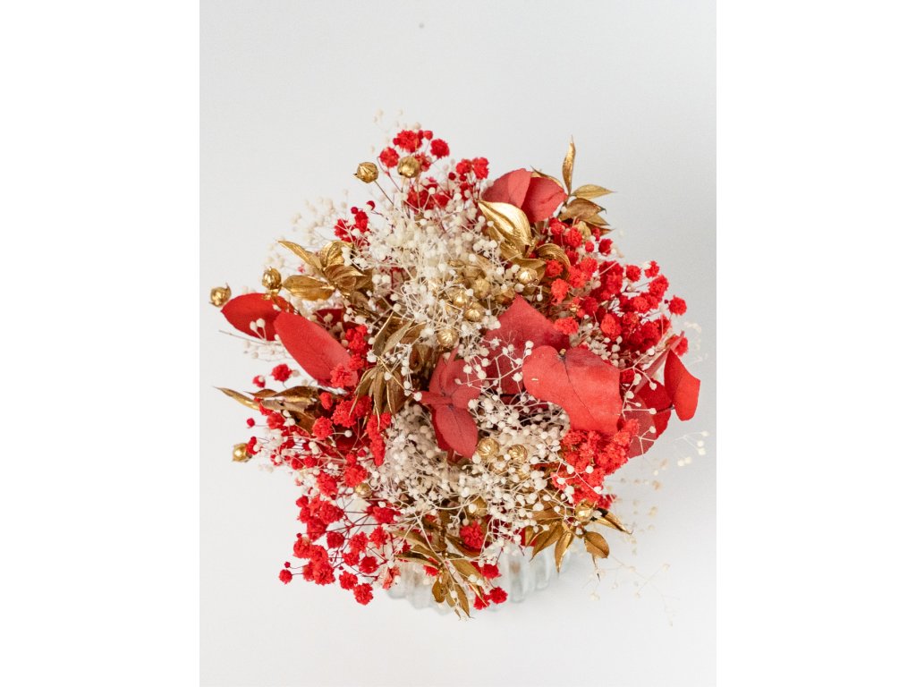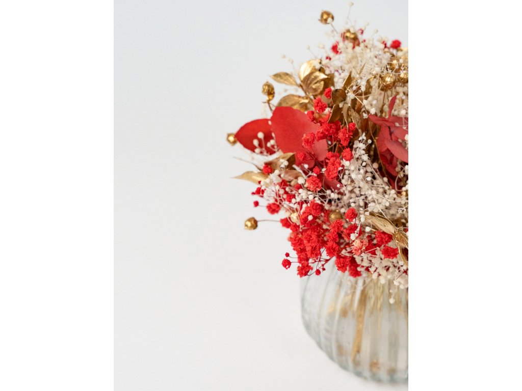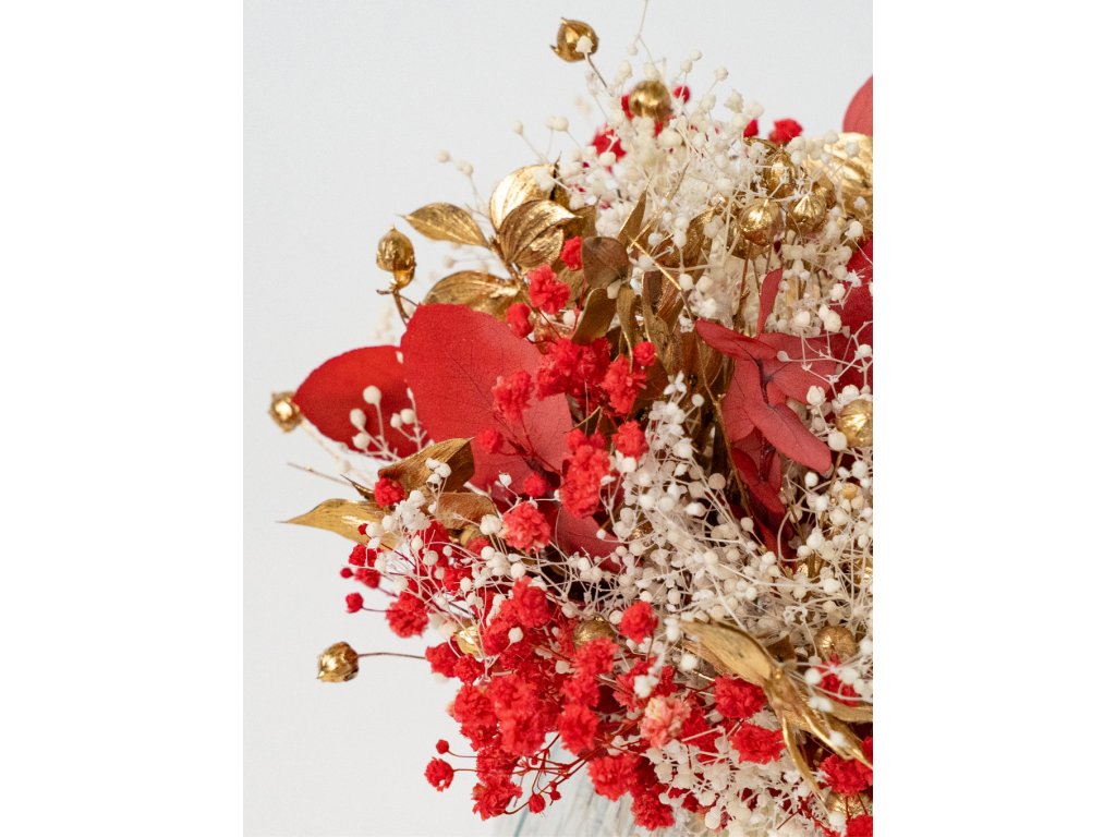 Aranžmán je ručne viazaný zo 100 % prírodných, stabilizovaných rastlín. Kombinácia červeného eukalyptu a gypsomilky a zlatých odtieňov ľanu a ruskusu, pôsobí ako dokonalé stvárnenie zimnej prírody. Harmonická farebná kombinácia červenej, zelenej a zlatej dodáva interiéru sviatočnú iskru, ktorá vydrží po celé obdobie Vianoc a aj dlho po nich.