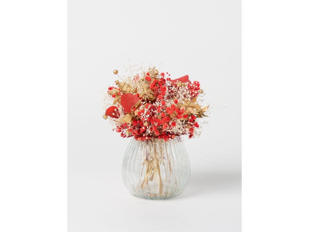 Vneste do svojho domova sviatočné teplo a eleganciu s aranžmánom „Red Winter“ – vianočnou dekoráciou, ktorá spája tradičné červené tóny s jemným zlatým leskom. Tento stabilizovaný aranžmán v sklenenej vázičke je dokonalou voľbou pre tých, ktorí chcú mať krásnu vianočnú výzdobu bez údržby.