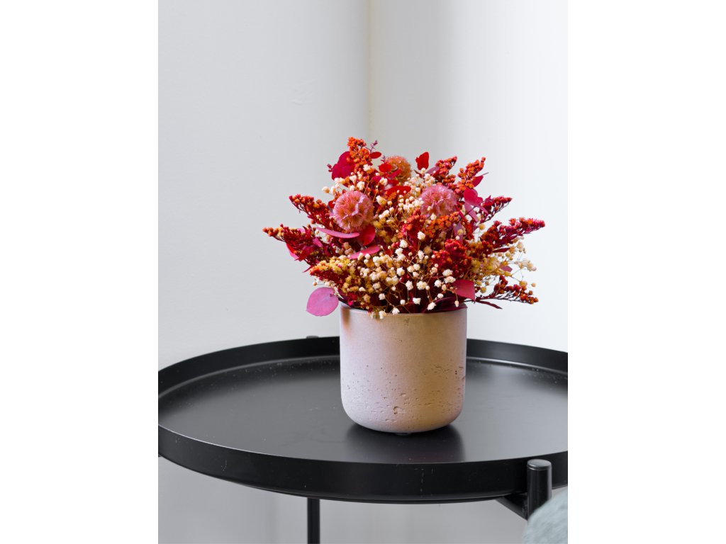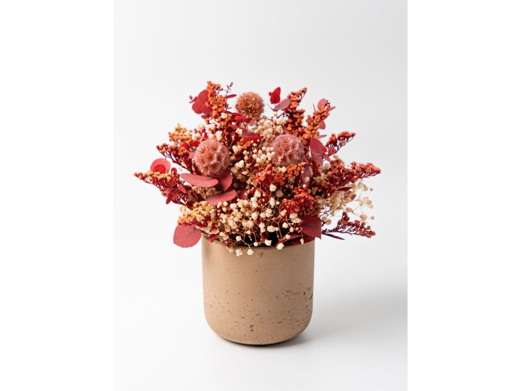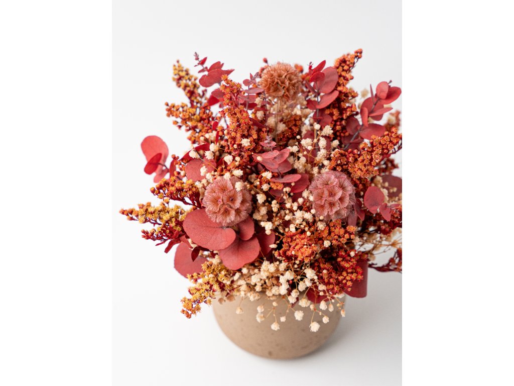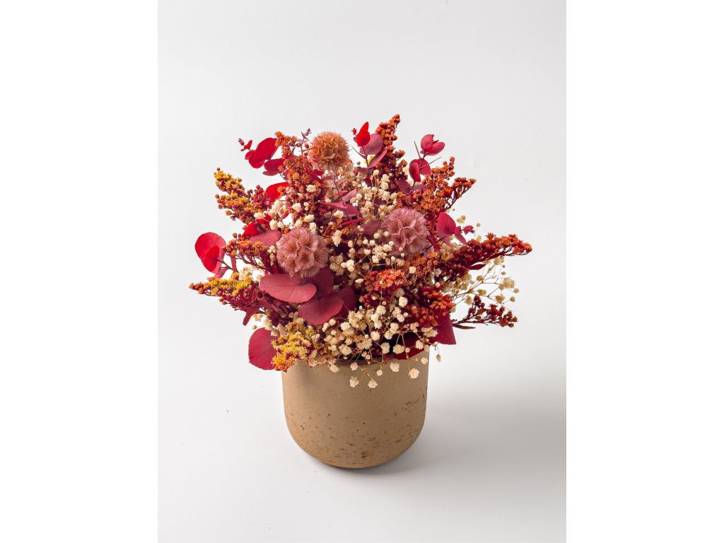 Základ tvoria stabilizované rastliny a kvety, ktoré si vďaka špeciálnemu procesu zachovávajú svoju farbu a sviežosť niekoľko rokov bez polievania či údržby. Nájdete v ňom zelený eukalyptus Nicoly, červený eukalyptus, lepto, solidago, žltú mini gypsomilku a zelenú kraspédiu.