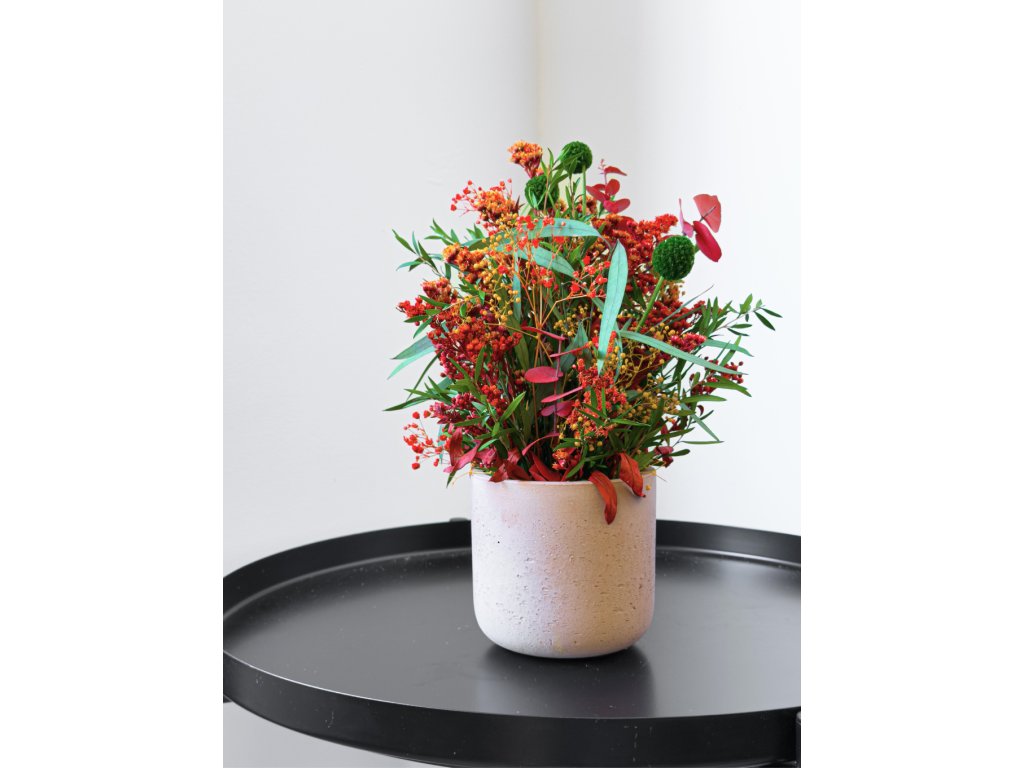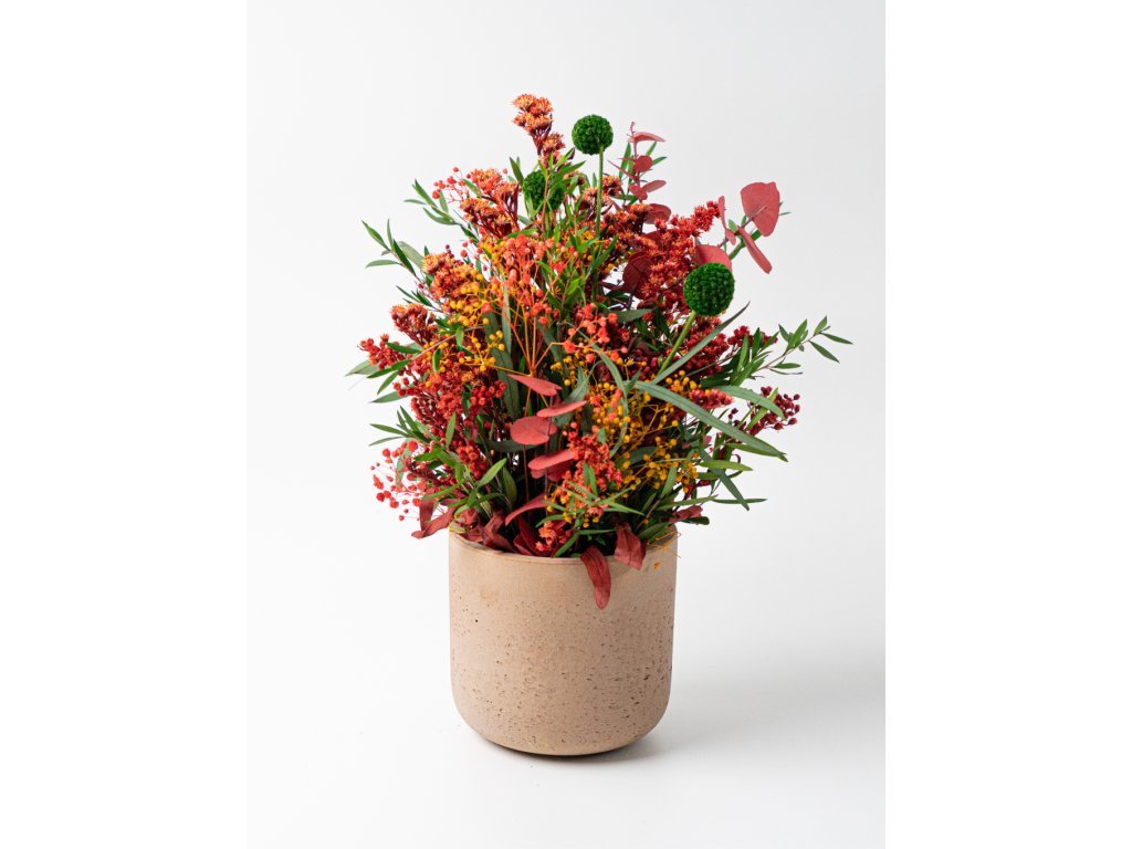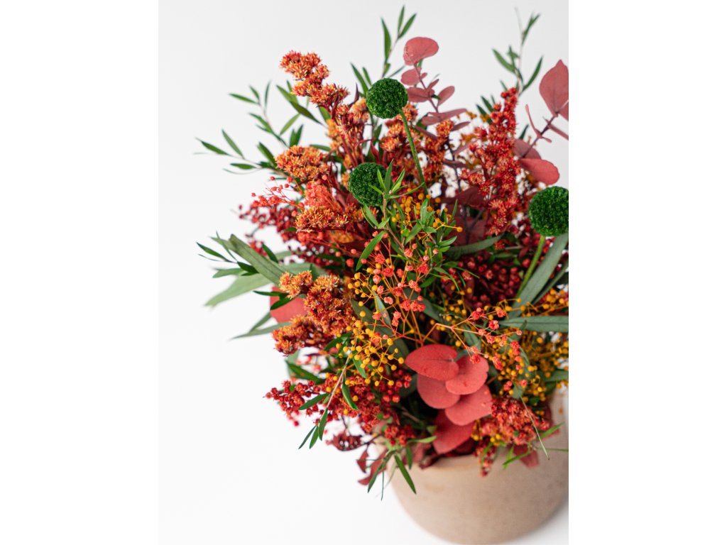 Základ tvoria stabilizované rastliny a kvety, ktoré si vďaka špeciálnemu procesu zachovávajú svoju farbu a sviežosť niekoľko rokov bez polievania či údržby. Kombinácia červeného eukalyptu, solidaga, lepta a žltej mini gypsomilky doplnená o zelenú kraspédiu vytvára energický, no vyvážený dizajn s nádychom jesennej elegancie.