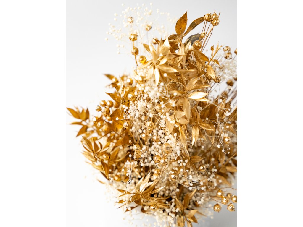 Aranžmán je vytvorený zo stabilizovanej bielej gypsomilky, zlatého ruskusu a zlatého ľanu, ktoré spolu vytvárajú svetlú, elegantnú kompozíciu symbolizujúcu pokoj a čistotu zimy. Každý kus je ručne aranžovaný u nás v LeListe.