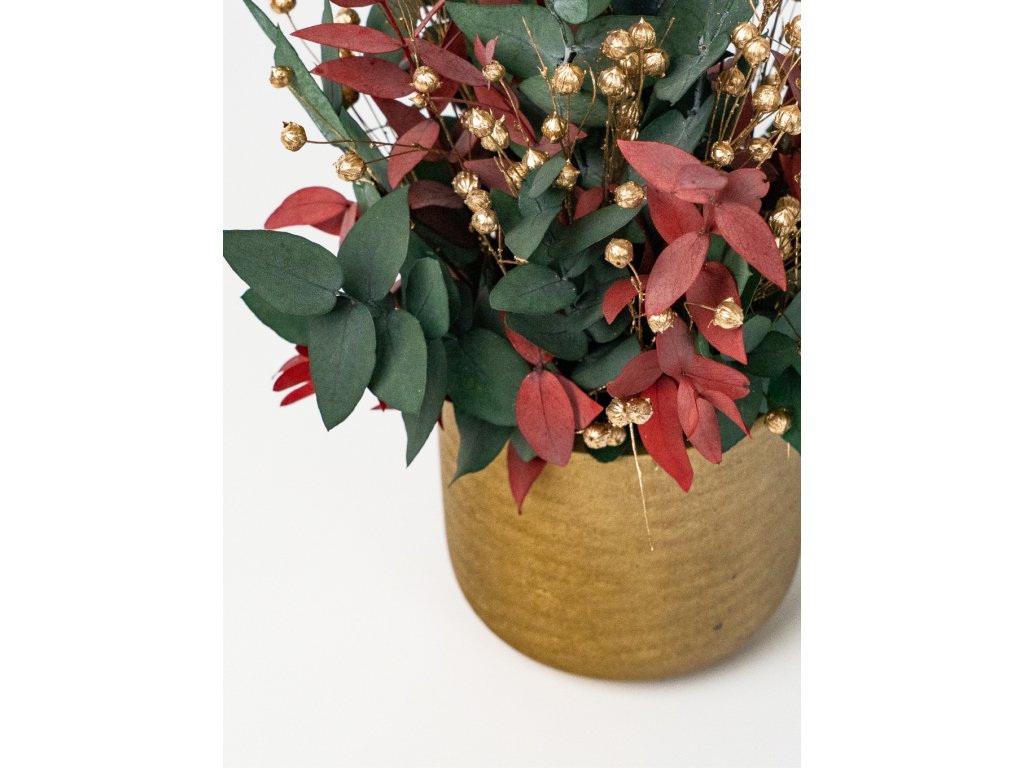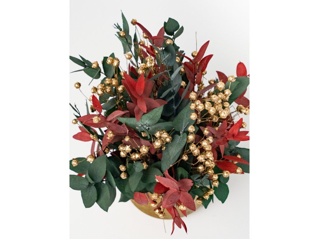 Stabilizovaný aranžmán “Christmas Eucalyptus” je dokonalým spojením sviatočných farieb a elegantných botanických štruktúr. Kombinuje hrejivé zlaté akcenty so zelenými a červenými odtieňmi stabilizovaného eukalyptu, čo vytvára harmonickú, modernú a slávnostnú kompozíciu. Umiestnený v luxusnom zlatom kvetináči, okamžite dodá interiéru sviatočnú atmosféru.