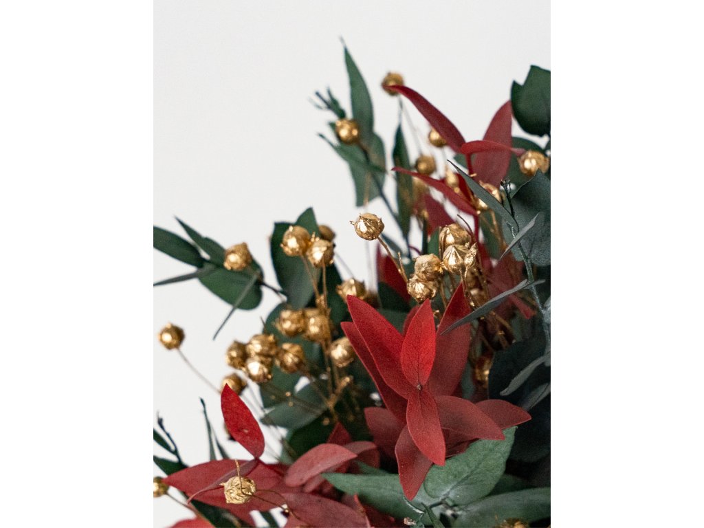 Kombinuje zelený eukalyptus Stuartiana, kontrastný červený eukalyptus Parvifolia a jemne trblietavý zlatý ľan, čím vytvára harmonickú vianočnú kompozíciu.