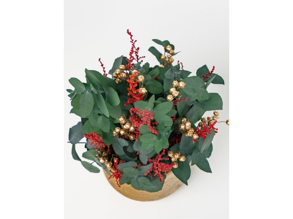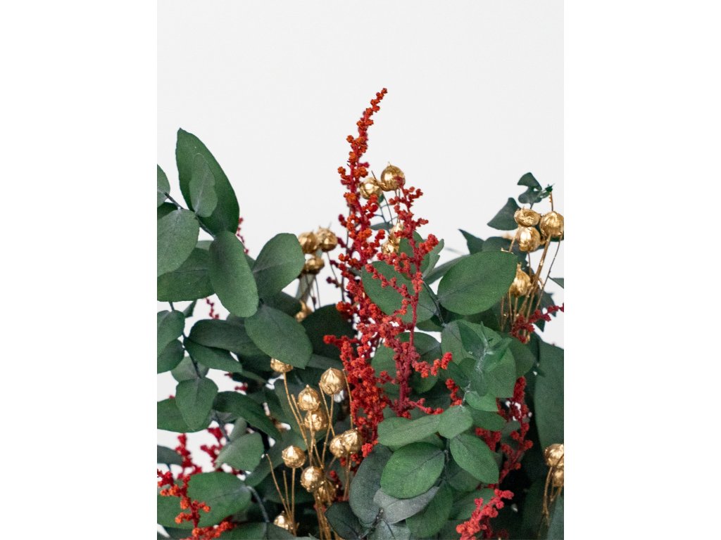 V aranžmáne dominuje eukalyptus stuartiana, ktorý dodáva celku bohatý objem a zelenú farebnosť. Dopĺňa ho stoebe v sýtej červenej farbe, ktorá prináša výrazný sviatočný kontrast. Celok dopĺňajú zlaté prvky ľanu, ktoré dekorácii prepožičiavajú jemný metalický lesk.