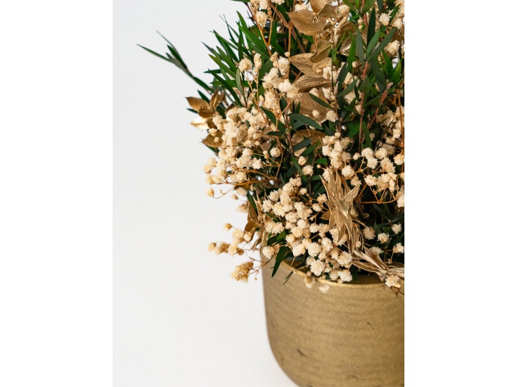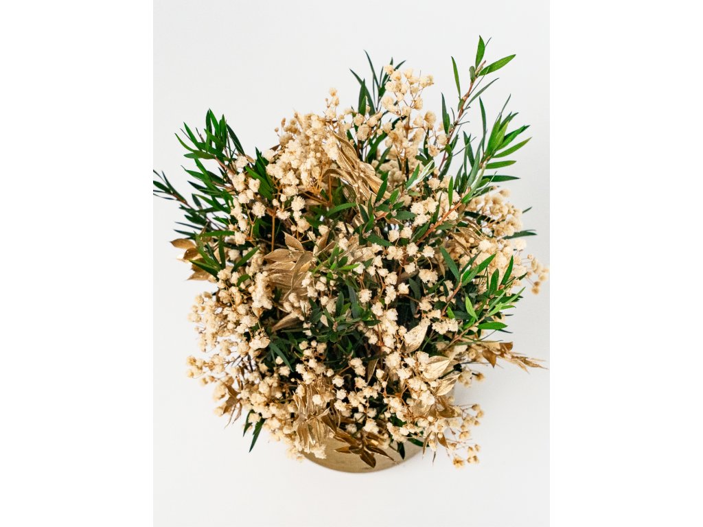 Základ aranžmánu tvorí stabilizované lepto v sýtej zelenej farbe, ktoré dodáva celkovému tvaru objem a prirodzený les. Dopĺňa ho prírodná stabilizovaná gypsophila so svojou jemnou textúrou a svetlým, krémovým tónom. Celok završuje zlatý stabilizovaný ruskus, ktorý celému aranžmánu prepožičiava sviatočný lesk a eleganciu.